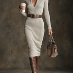 Rochia Emma combină confortul tricotului cu eleganța unei siluete ajustate. Designul său cu guler mediu înalt și decolteu în V creează o linie rafinată și modernă, în timp ce cureaua subliniază figura cu o notă structurală și sofisticată.